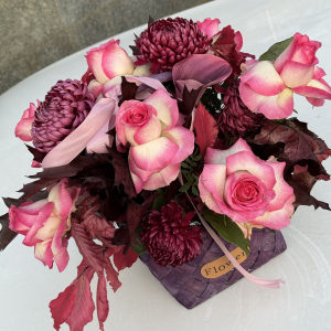 Un aranjament floral elegant, realizat într-o cutie tip sacoșă decorată cu fundă roz satinată. Florile alese cu grijă îmbină trandafiri roz pal, flori albe delicate și accente bordo-fucsia, creând un contrast armonios și rafinat. Compoziția este completată de detalii verzi naturale și elemente decorative, ideale pentru a aduce un plus de eleganță și prospețime.