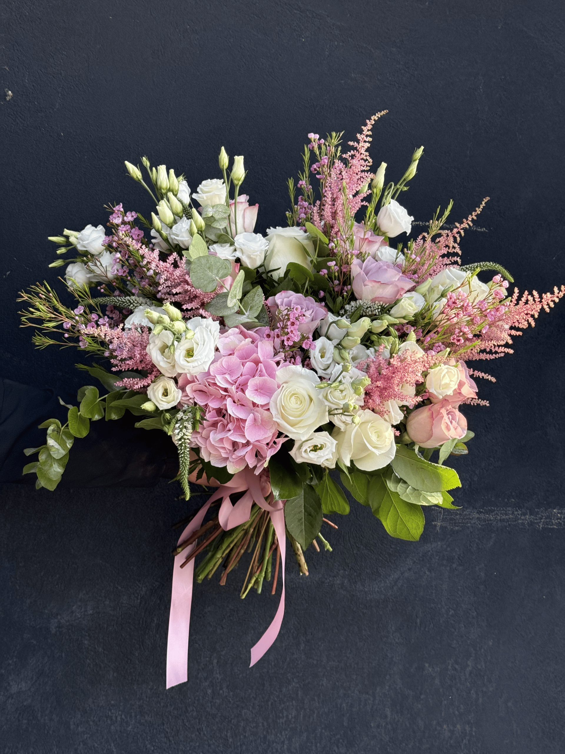 Un buchet pastel deosebit, creat din flori premium în nuanțe fine de roz pal, alb și lila, cu texturi bogate și aspect modern. Hortensia roz devine elementul central, fiind înconjurată de lisianthus alb, trandafiri pastel, astilbe și accente florale aerate care dau volum și eleganță. Verdeața proaspătă echilibrează armonios compoziția, iar panglica satinată roz completează perfect look-ul final.